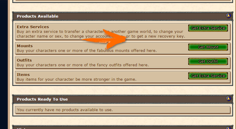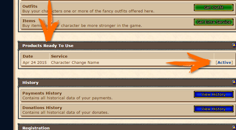 For the service go to the page where it contains todas as informações de sua conta. Go to the box Products Ready To Use, nit will be all the services you bought in the shop and need to be activated in your account or one of your characters. Choose the service you want to activate (if there is more than one) and then click Active. (Click on the image to enlarge.)