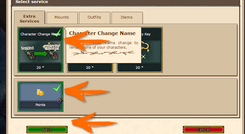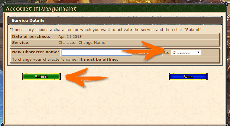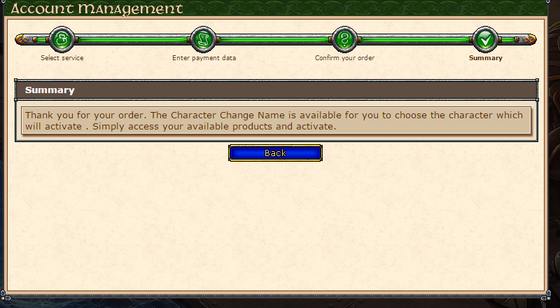 On this next page you will see the data of the product you have bought, and the option to choose which character to activate the service. In the case of our example the service is a name change, then there is a field for the new name, and beside which character will receive the new name. Selecting everything correctly click on Next, and the service has been activated for your character. Remember that in the case of the name change your character must be logged off. (Click on the image to enlarge.)